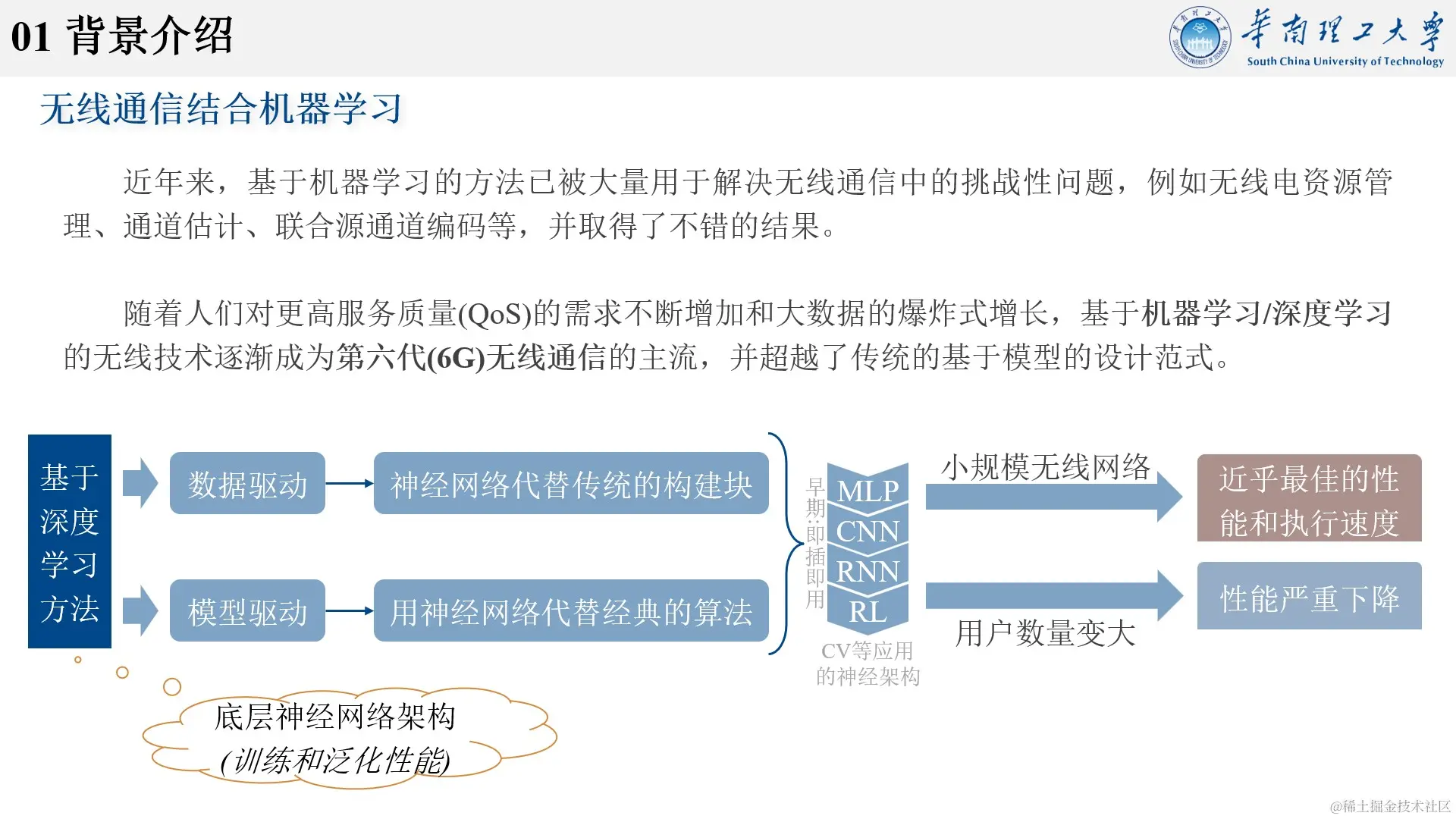 基于以上两点,近年来,越来越多的研究者开始采用机器学习的方法来研究无线通信中的挑战性问题,例如无线电资源管理、通道估计、联合源通道编码等,并取得了不错的性能提升。