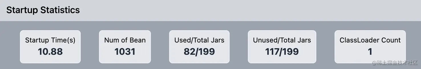 - 启动的统计数据。其中包括:启动时间、Bean的数量、使用/总共的JAR包数量、未使用/总共的JAR包数量、ClassLoader数量