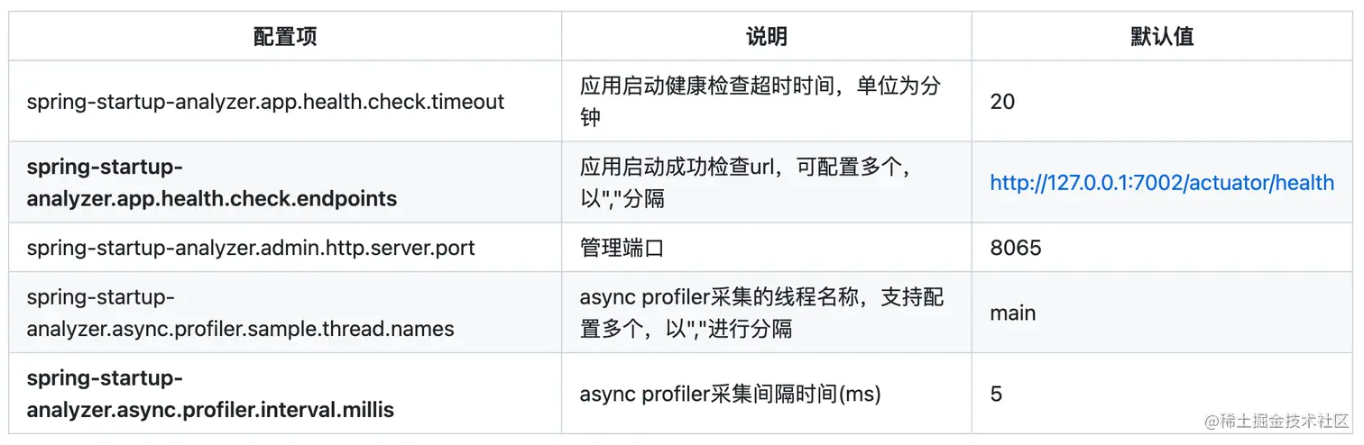 -Dspring-startup-analyzer.app.health.check.timeout=30,其他可配置项如下表,你可以工具自己应用的情况去修改: