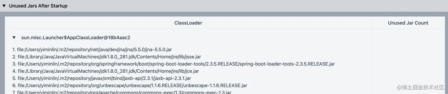 - 启动后未使用的JAR。列出了所有Spring应用启动后没有使用的jar包,可以有效的帮助你清理不需要的依赖,为应用瘦身
