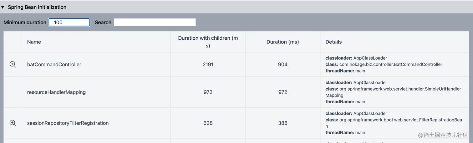 - Bean初始化时间线。通过时间线的方式,清晰地展现了Spring应用启动时候,各个Bean的顺序关系以及时间消耗