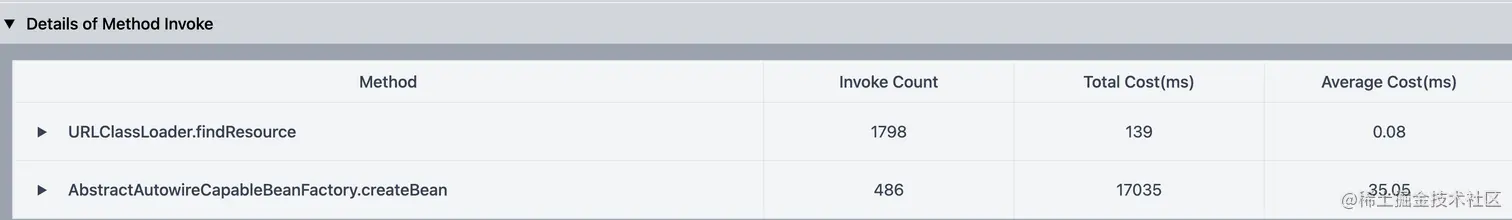 - 方法调用的详细信息。这里统计了每个方法的调用时间、总时间开销和每次调用的平均时间