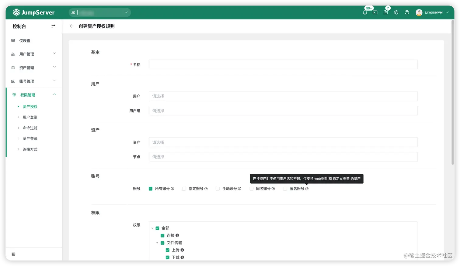 在JumpServer v3.5.0版本中,新增匿名账号的授权。匿名账号没有用户名和密码,当连接Web和自定义类型的资产时,可以不代填任何认证信息,仅仅只是拉起了远程应用。
