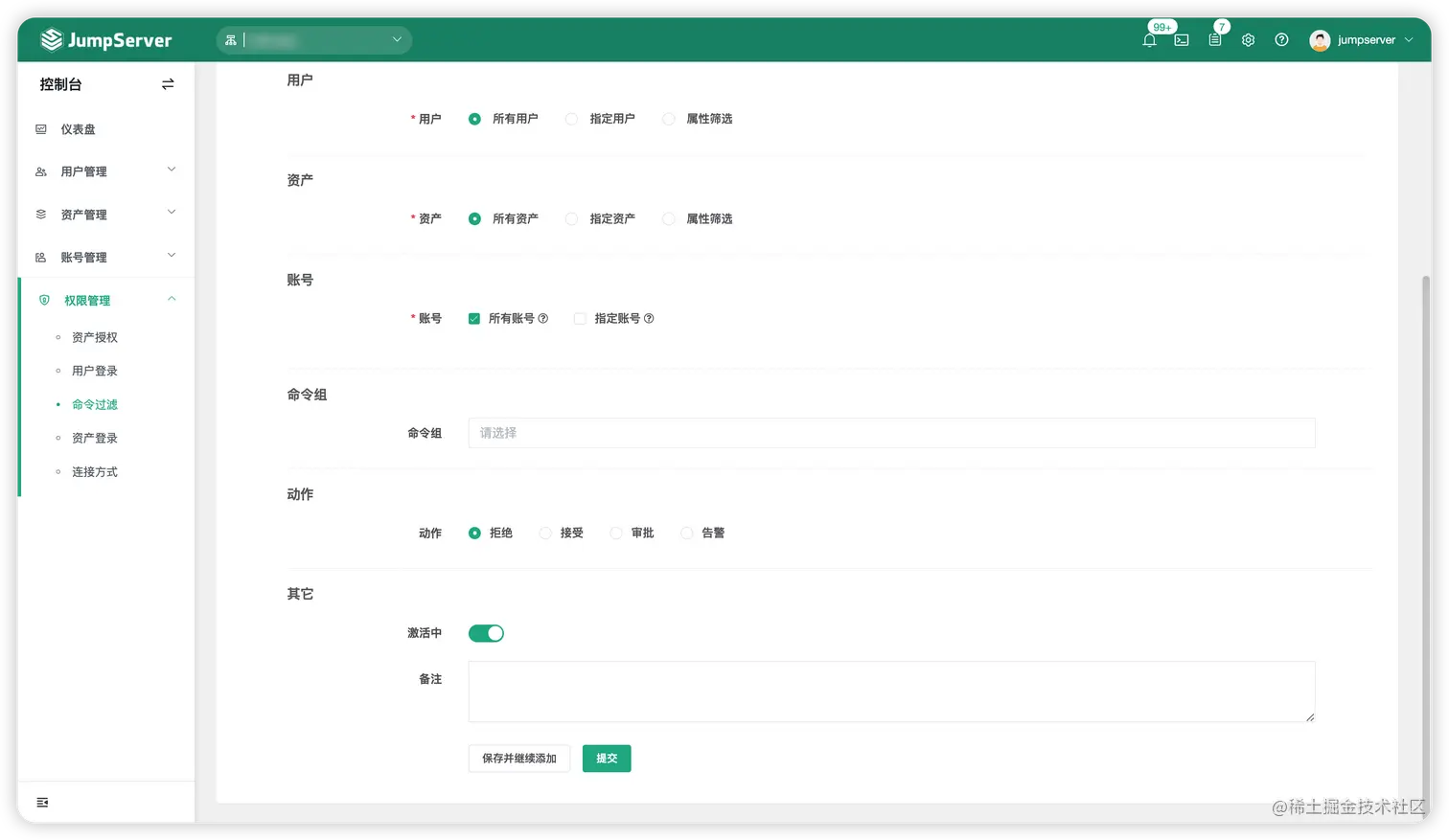 在JumpServer v3.5.0版本中,命令过滤功能除了支持“拒绝”、“接受”、“审批”动作以外,还新增支持“告警”动作。当命令过滤规则匹配到用户执行的命令时,系统会自动将用户执行命令的行为以告警消息的方式推送给指定人员,进一步提升系统的安全性。