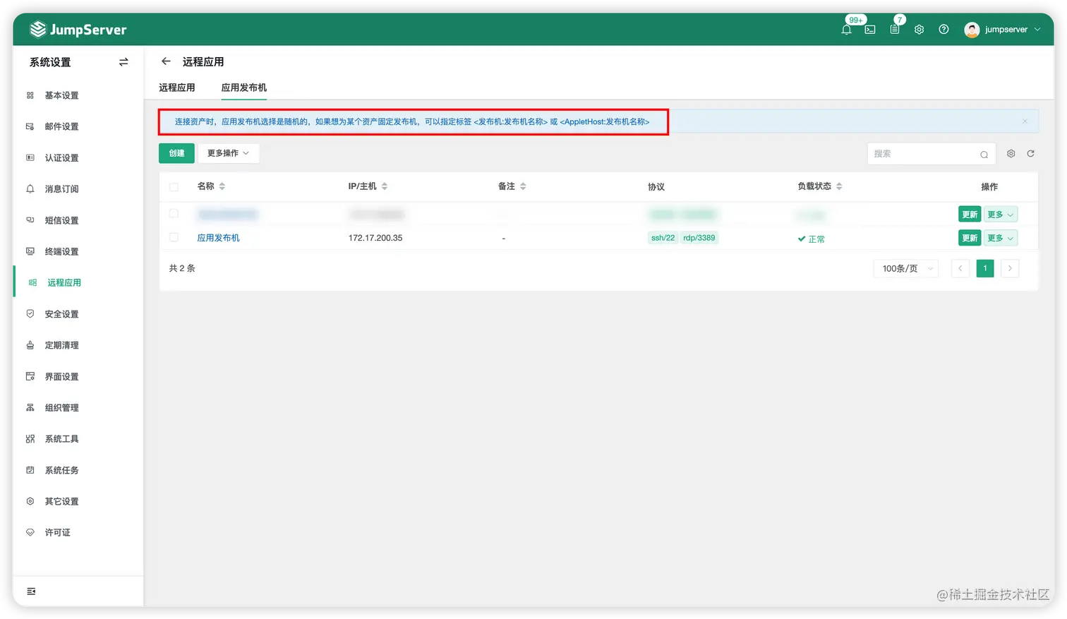 在JumpServer v3.5.0版本中,用户通过使用资产标签匹配机制给某个远程应用资产配置标签后,可以指定远程应用发布机连接到此远程应用。注:标签名为“发布机”或者“AppletHost”,值为发布机的名称。