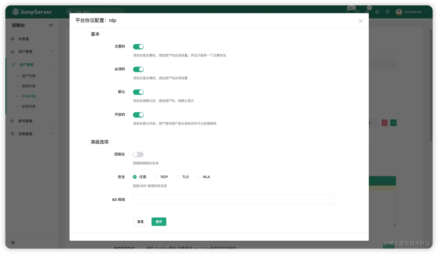 在JumpServer v3.5.0版本中,在Windows资产平台中配置AD域后,可以在连接该平台类型的资产时使用AD域用户进行登录。