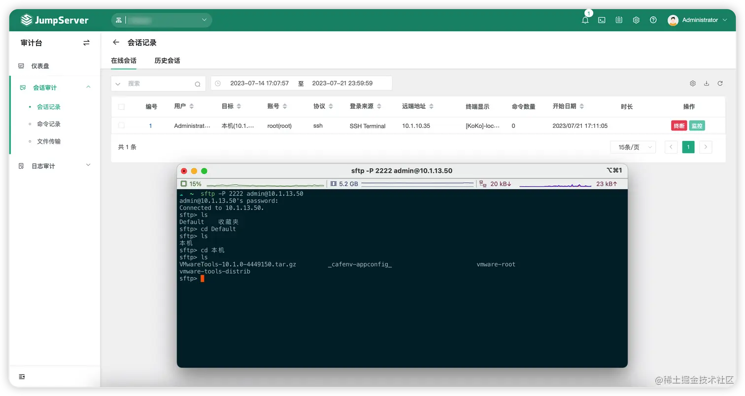 在会话审计方面,JumpServer v3.5.0版本的会话记录功能支持对SFTP会话进行审计。