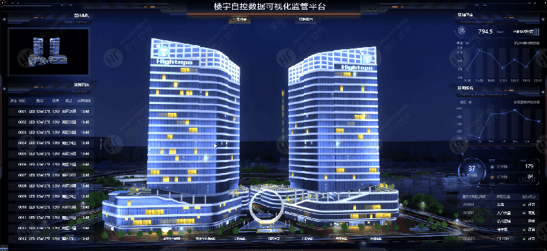 楼宇自控方面应用 HT 数据可视化监管平台通过还原楼层内照明设备点位,并对接照明控制系统,实现现实与三维场景的联动,足不出户便可以对建筑内所有照明设备状态进行监管控制,减少日常照明能耗,做到真正的智慧照明。