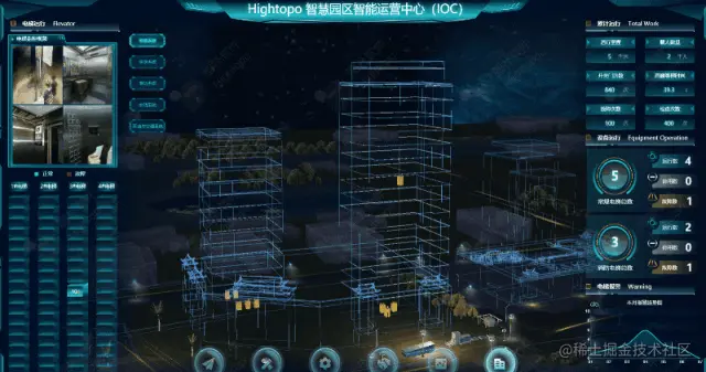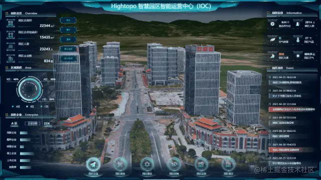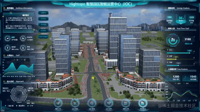 在图扑 HT 智慧园区智能运营中心 IOC 系统中,通过对整体园区进行倾斜摄影并生成三维场景模型,并结合地理信息系统(GIS),以此高度还原园区内的建筑、道路环境、园区设施以及周边环境等。