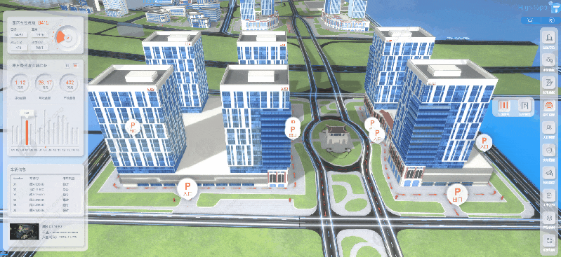 图扑通过自研 HT for Web 打造的智慧园区数字孪生系统,真实还原出园区的三维场景,并细化展示安防、消防、照明、空调、电梯、给排水、电力等设备。辅以两侧数据看板,可直观展示楼宇的资产数据、环境数据、安防数据等。实现人机交互、信息共享、安全监控、节能环保等功能,包括但不限于园区内人员和设备管理、能耗监控和调节、安全监测和预警、智能化交通管理等。其目的在于提升居住和工作环境的整体品质,为城市的可持续发展做出贡献。