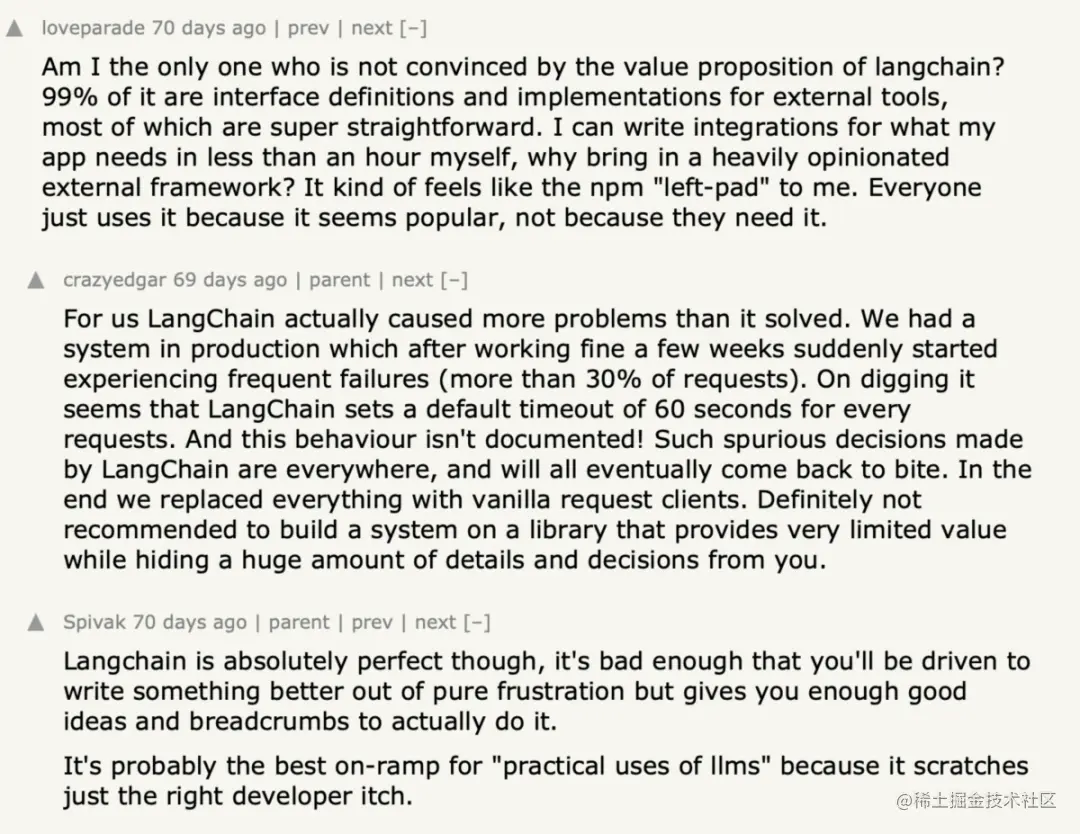浪费了一个月的时间来学习和测试 LangChain,我的这种生存危机在看到 Hacker News 关于有人用 100 行代码重现 LangChain 的帖子后得到了缓解,大部分评论都在发泄对 LangChain 的不满: