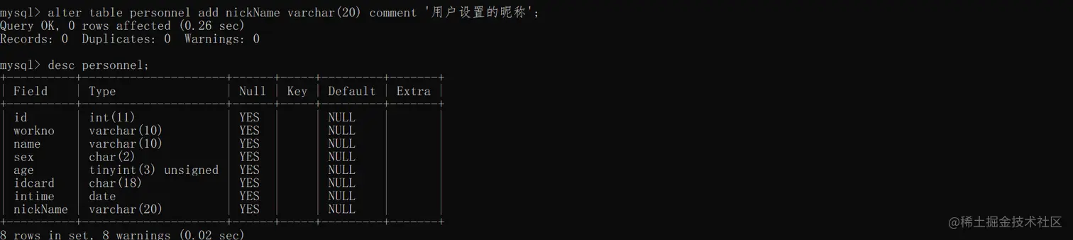 alter table personnel drop userNickName; 删除的是刚刚新增的这个字段
