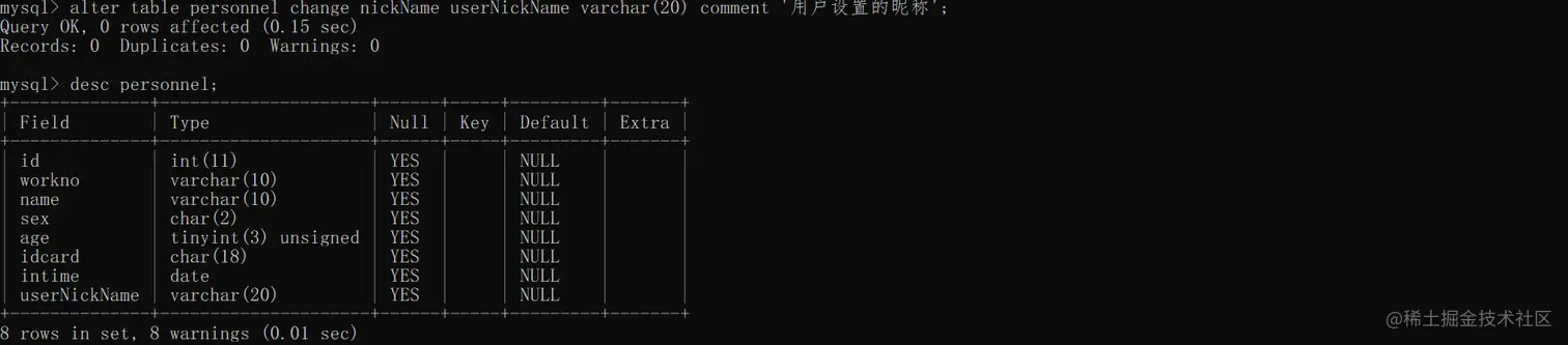 alter table personnel change nickName userNickName varchar(20) comment '用户设置的昵称';