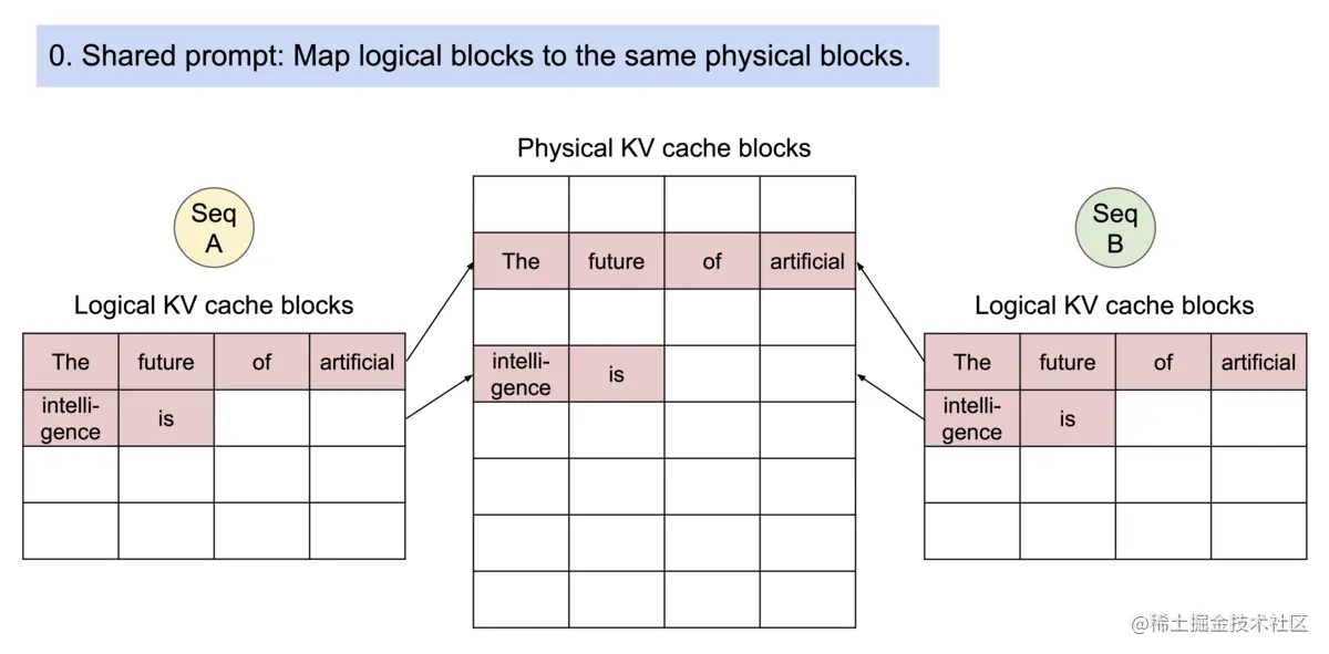 由于块在内存中不需要连续存储,我们可以像操作系统的虚拟内存那样以更加灵活的方式管理键和值的缓存:可以将块看作页,标记看作字节,序列看作进程。序列的连续逻辑块通过块表映射到非连续的物理块。随着生成新的标记,序列的边长,物理块按需进行分配。