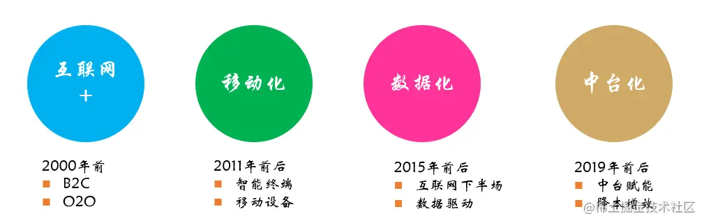 - 中台时代:2019年被很多人称之为中台元年,中台之所以被当作数字化转型的救命稻草,本质是因为中台的复用能力,数据快速服务化输出的能力,可以更快的实现数据赋能。