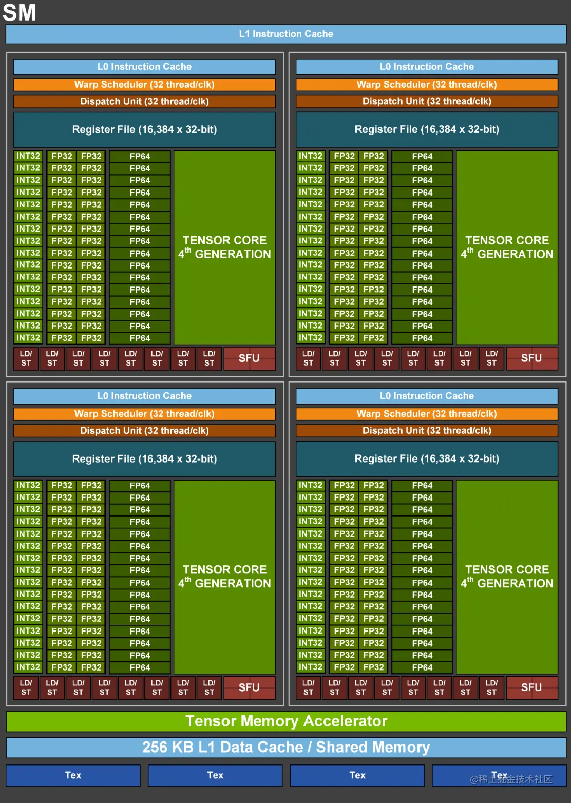 L1 Cache/SMEM:L1 Cache包含指令缓存(Instruction Cache)和数据缓存(Data Cache),在SM内部存储最常用的指令和数据,每个SM独享一个L1 Cache,提供低延迟和高带宽的访问。