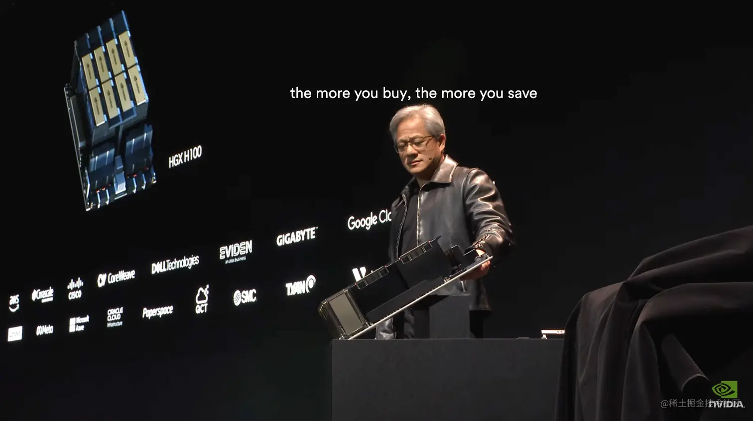至此,更快的运算速度,更大的通信带宽结合就完成了当下供不应求的最强加速卡H100。下面以Nvidia CEO黄仁勋在Computex 2023上的一句话作为结尾。The more you buy, the more you save.