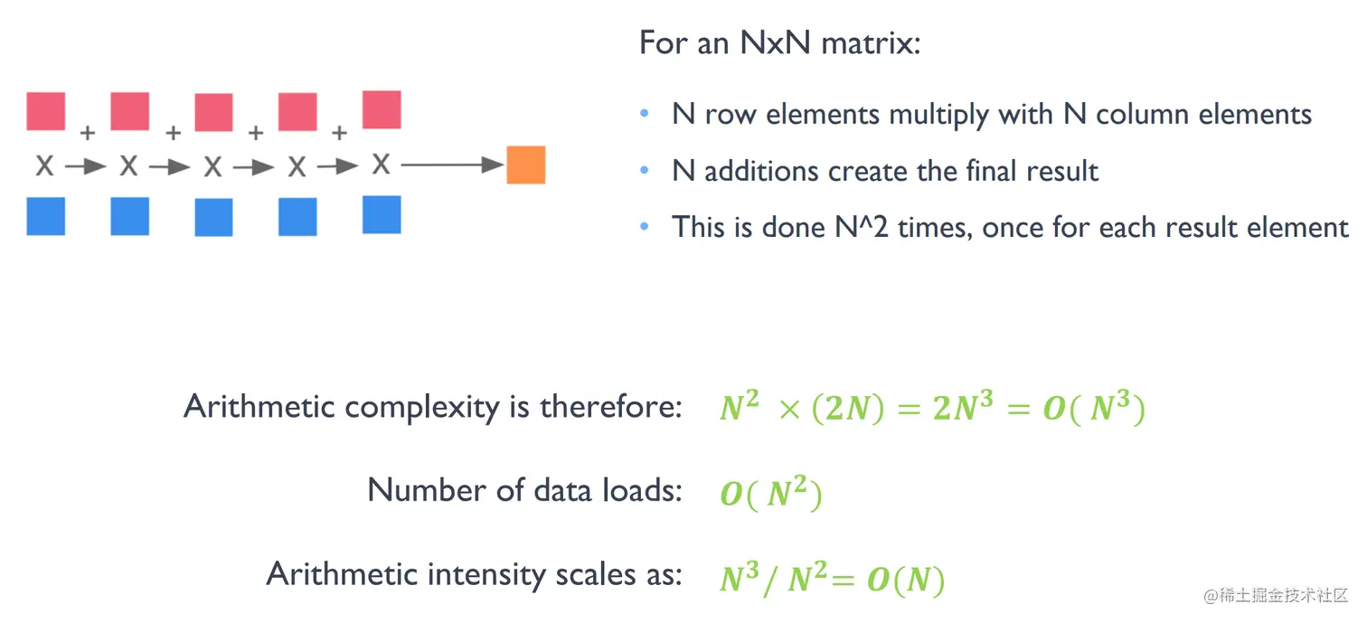 对于N阶方阵的乘法操作,其计算时间复杂度为,访存时间复杂度为,其计算强度为.