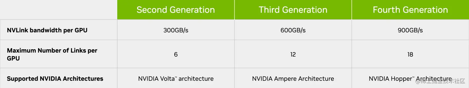 NVLINK1.0在Pascal架构中提出,从Volta开始成型,每条NVLINK提供50GB/s的通信带宽,在Volta架构每个GPU最多支持6条NVLINK,提供300GB/s的GPU间通信带宽。