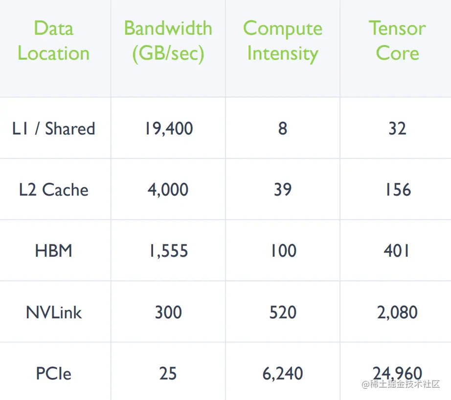 其中访存速度如下图所示(以A100为例)