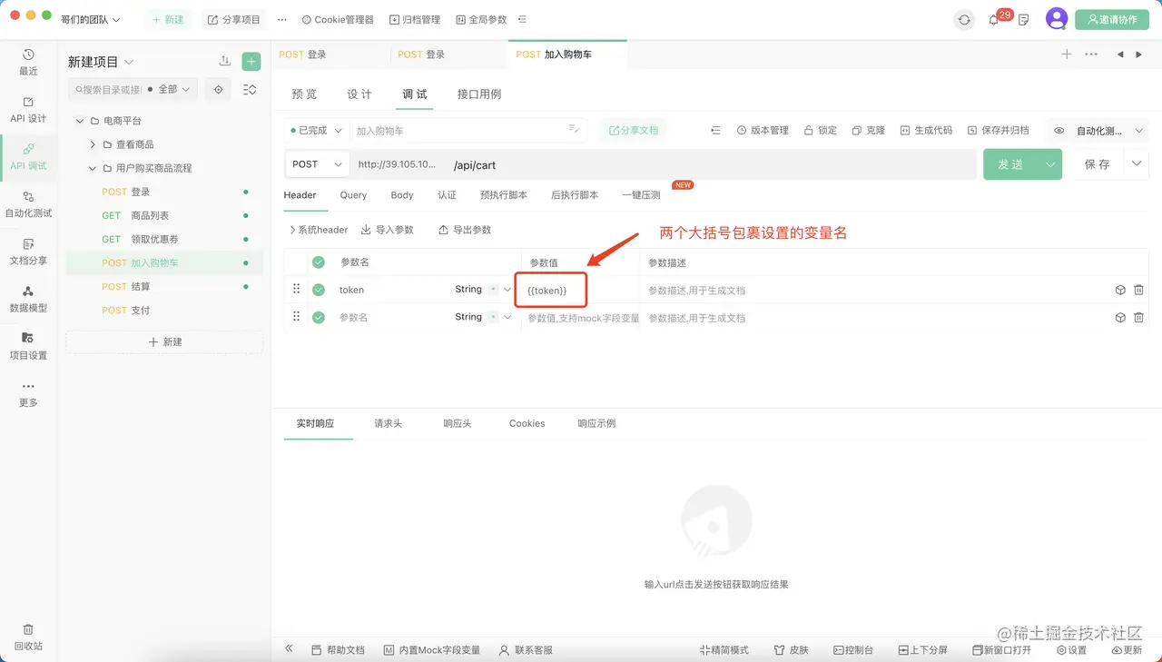 加入购物车,领取优惠券,结算,支付接口会验证登录接口返回的Token令牌,需要将Token令牌设置为环境变量配置到这几个接口中的请求头中。
