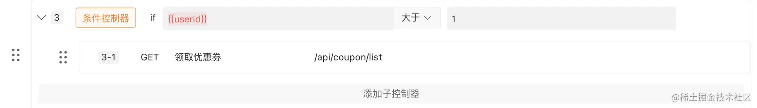 根据用户ID调用领取优惠券接口:使用条件控制器,用户ID大于1的用户会调用领取优惠券接口。配置如下图: