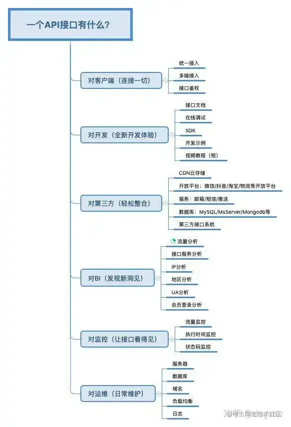 小编在大学花了四年时间学习软件工程这门专业,尔后又花了近十年时间在上市公司、互联网、创业等公司负责后端系统的开发,经历了商城、游戏、广告等行业的项目开发,同时在接口开源框架有近5年的积累,结合教育背景、工作经验、业务知识、项目和技术,总结了一个API接口应该包括但不限于以下方面: