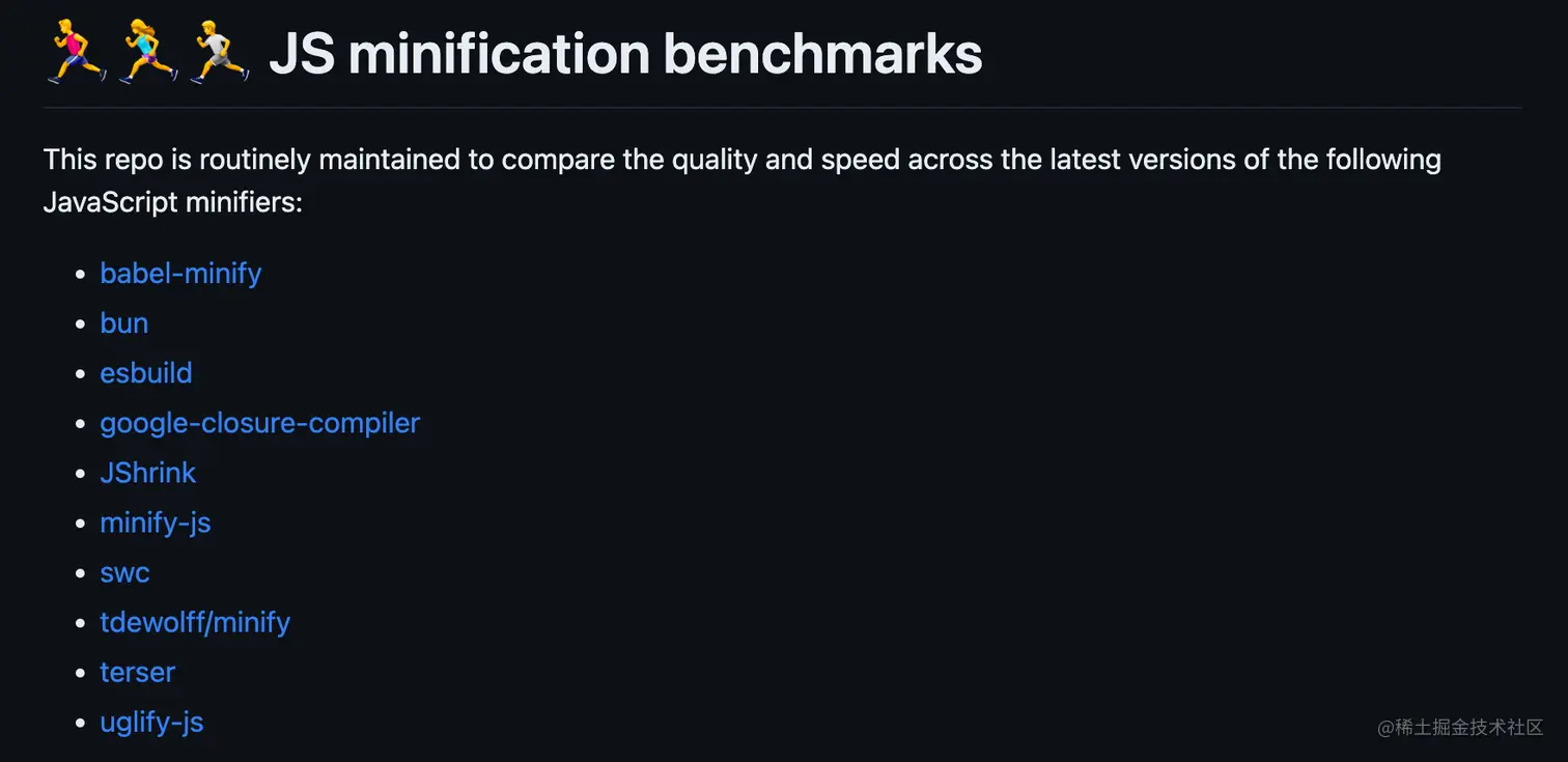 该仓库用于 JavaScript minifier 基准测试,测量了压缩的平均时间以及产物大小等关键的性能指标。