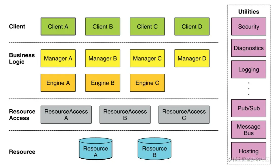 比如,某大厂上层Client客户端可能是电商、团购等,Business Logic业务逻辑层包含金融支付、收单和积分等业务,Resource Access 资源访问层是各种中间件,Resource 是数据库、块存储等。贯穿始终的是旁边的Utilities工具条,包含不限于日志、监控和告警。