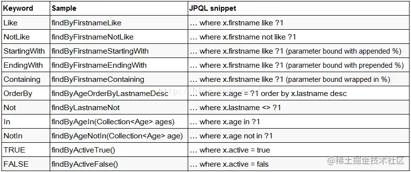 你可以直接在接口中定义查询方法,只要符合规范,就无需编写实现或 SQL。目前支持的关键字写法如下:
