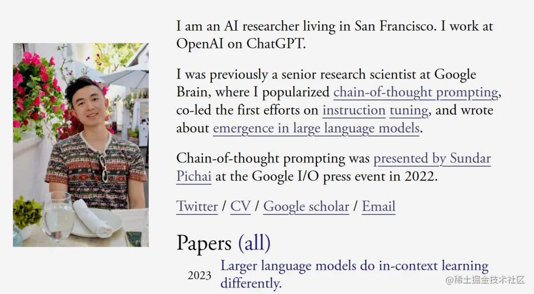 他是思维链概念开山之作 ——「Chain-of-Thought Prompting Elicits Reasoning in Large Language Models」的第一作者,本科毕业就加入了谷歌。在那里,他推广了思维链提示概念,共同领导了指令调优的早期工作,并和 Yi Tay、Jeff Dean 等人合著了关于大模型涌现能力的论文。