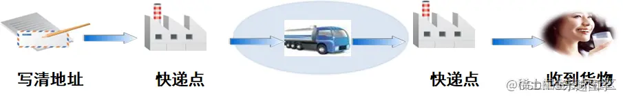 -->发件人将有收货人地址信息的货物送到快递站,发件人不用关心物流是如何进行的,货物被送到收货人所在地区的快递站点,进行配送,收货人等待收货就可以了。