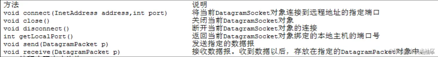 (6)DatagramPacket类不提供发送或接收数据的方法,而DatagramSocket类提供send() 方法和receive() 方法,用于通过套接字发送和接收数据报。
