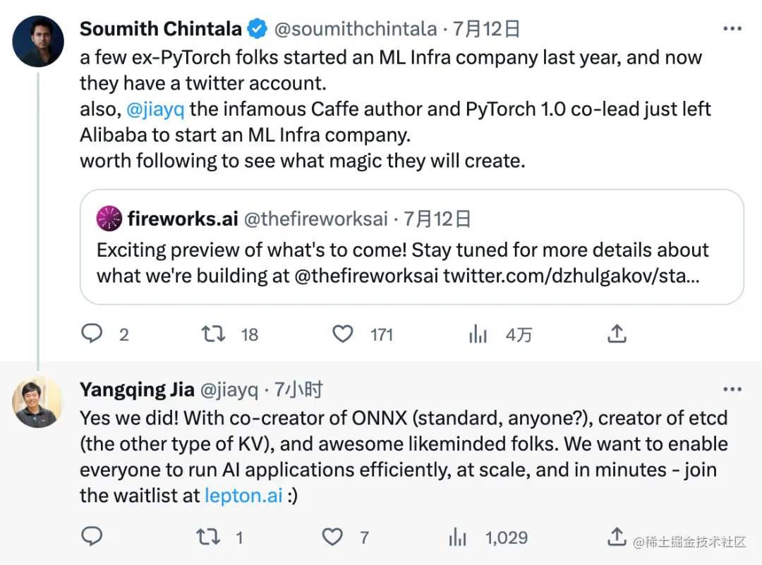 同时他也在 Twitter 中圈了贾扬清,称他也从阿里巴巴离职创建了一家机器学习基础架构公司,看来大佬创业的消息在一定范围内已经传开了。