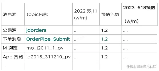 (1) 压测目标设定,一般会参照历史峰值和市场预估,给出核心交易、流量主题链路峰值预估,例如22年双11的1.2倍。关键的数据流topic,会给出预估消费峰值供下游参考,如下表格所示(数据涉及保密不做详细展示)