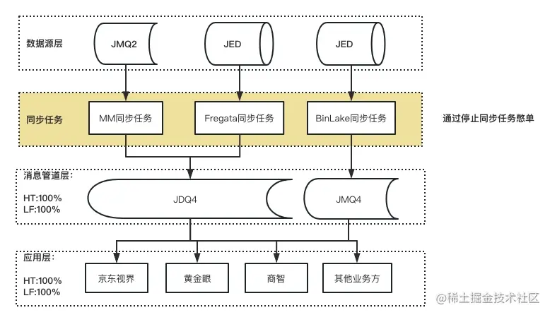 (2)流量的憋坝方式,流量无损憋坝压测是通过停止采集服务写JDQ写集群的方式憋流,不参与压测的业务方,可以切换到 “JDQ4澜沧江_点击流新建流” (压测期间新建JDQ写集群) , 保证下游业务可以在憋流压测期间,正常消费流量实时数据,做到无损。