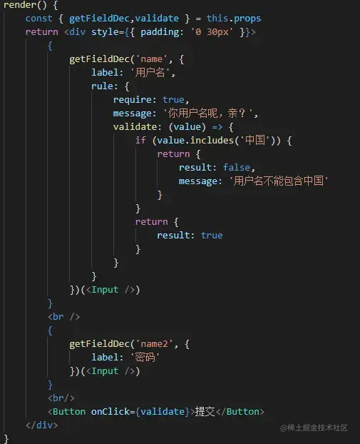 将validate和getFieldDec传递给原始组件,前者用于校验,后者用于包装表单行