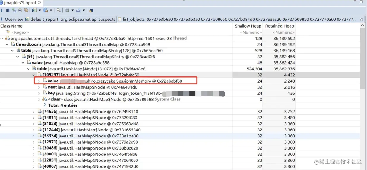 查看内存详情保存最大最多的对象是ThreadLocal中存储的SessionInMemory对象