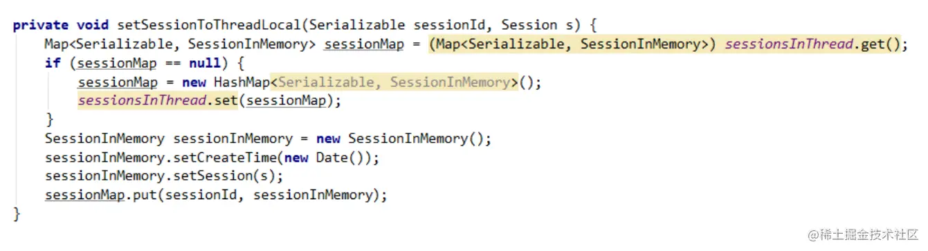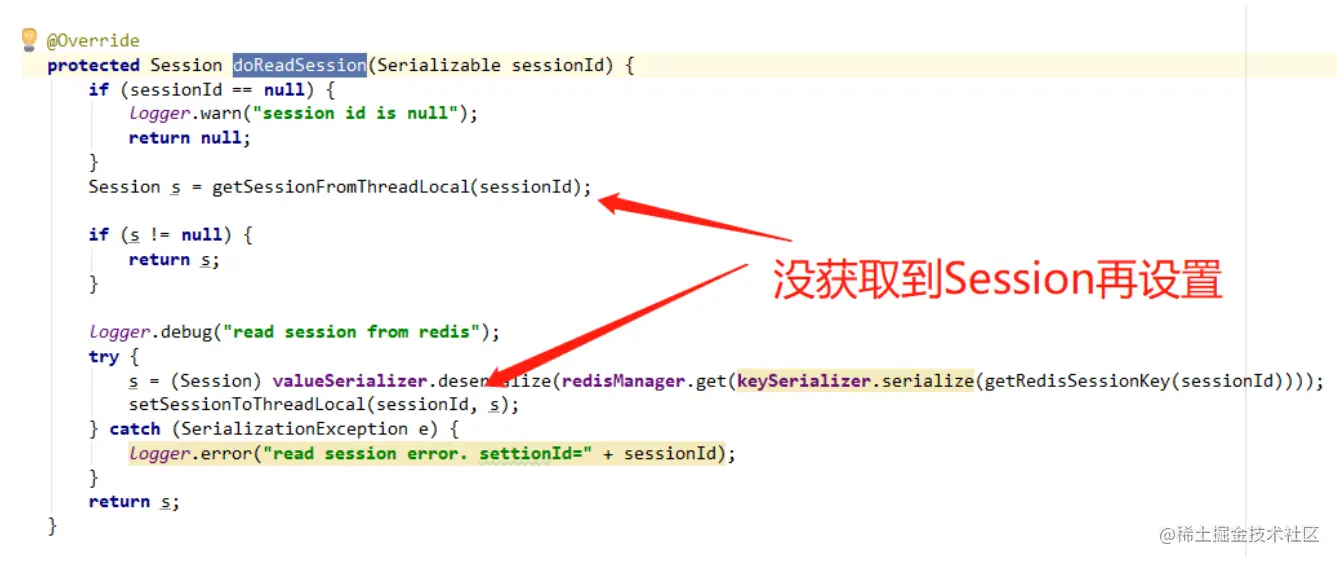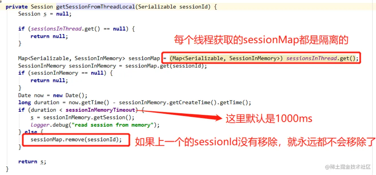 下面的方法主要整合了获取Session操作和设置Session操作,如果从ThreadLocal中没有获取到或者本地缓存超过1秒了就返回null,判断为null之后就会从redis中获取并新建一个Session存储到ThreadLoca中