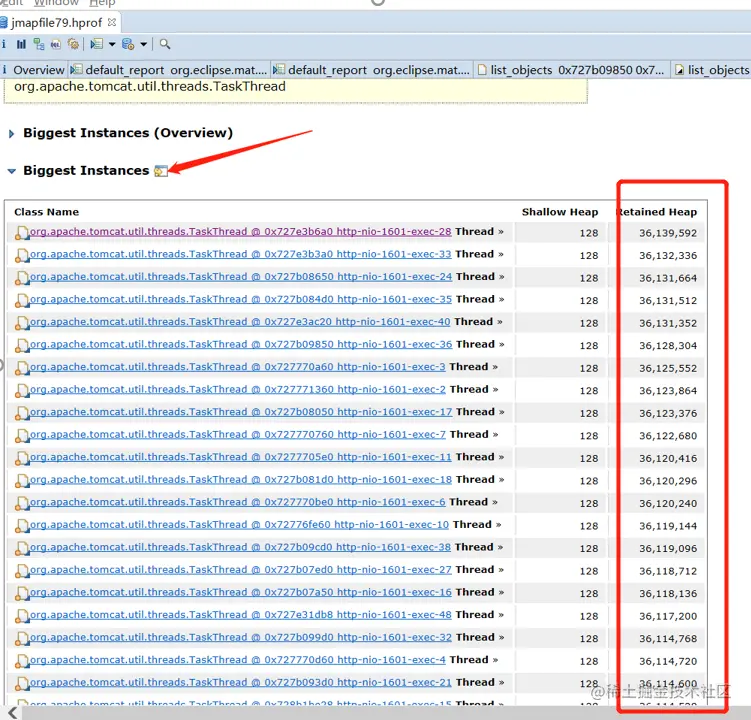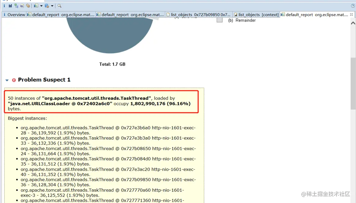 从堆栈文件分析结果中发现有50个org.apache.tomcat.util.threads.TaskThread占用空间很大。共占用空间96.16%