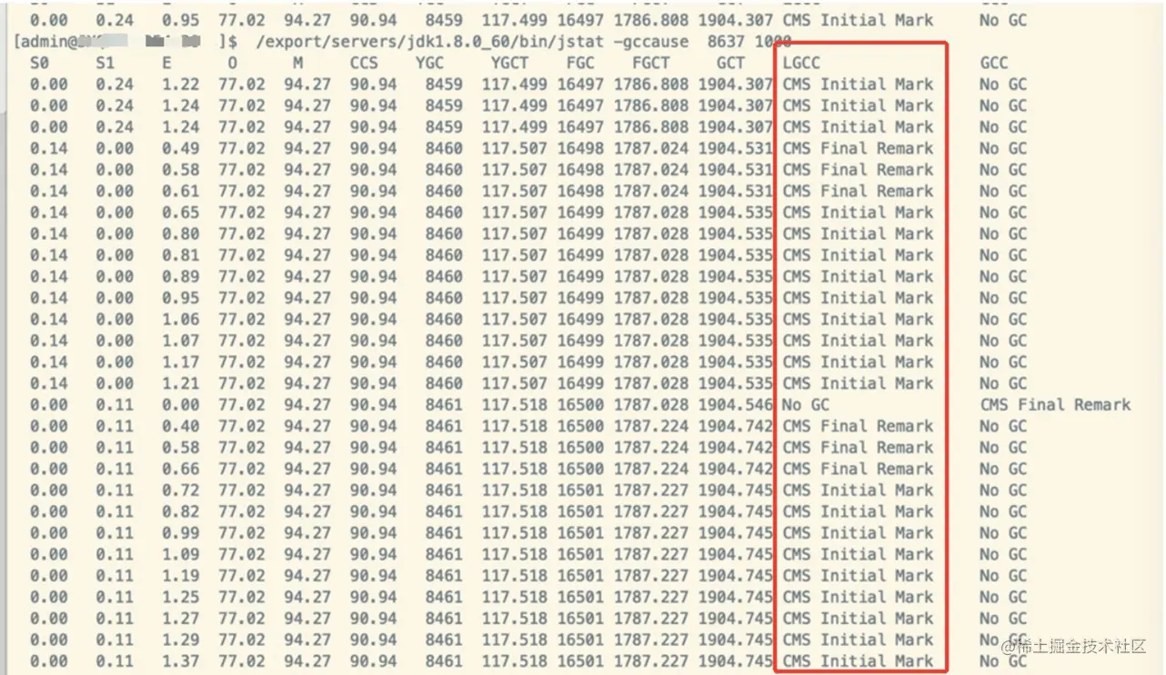 在查询堆栈前执行GC原因指令:jstat -gccause [pid] 1000,执行结果如下图,可以看到 LGCC 这一列代表了最后执行 gc 的原因。CMS Initial Mark 和 CMS Final Remark 这两个阶段是 CMS 垃圾回收的初始标记和最终标记阶段是耗时最长也是造成 STW(Stop The World)的两个阶段