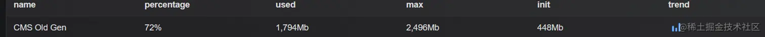 下图是进行FullGC时候的老年代内存情况,把下面的72%、1794Mb、2496Mb、448Mb先记住,下面会跟这些值做对比