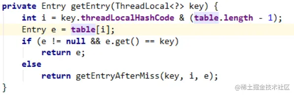从 ThreadLocalMap 中获取指定的 value,又有个疑问,获取 Entry 为什么还要从一个 table数组中拿呢?这个很好理解一个线程不一定只有一个 ThreadLocal 变量吧,多个 ThreadLocal变量就是有多个 key,所以就放到 table 数组里面了
