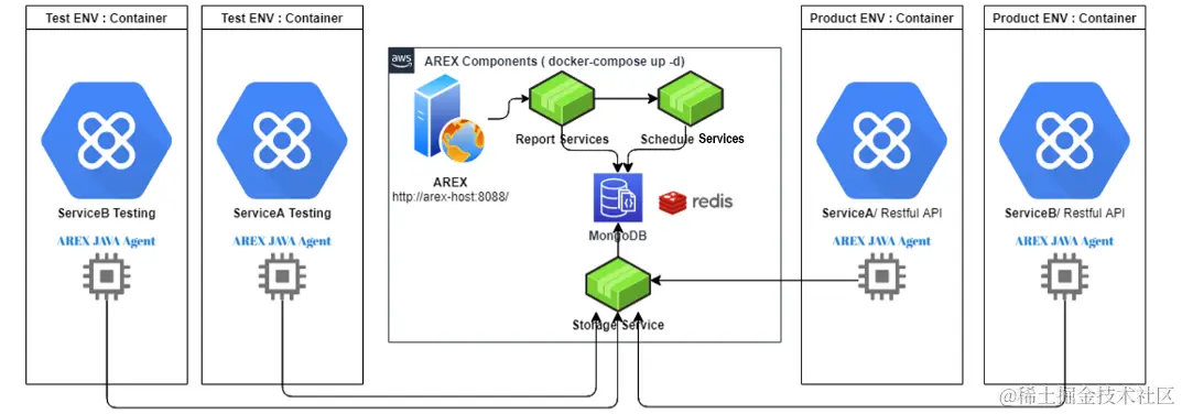 AREX 包含了 Java Agent 和前端、存储、调度、报告、数据库等服务组件 ,整体架构如下图所示。