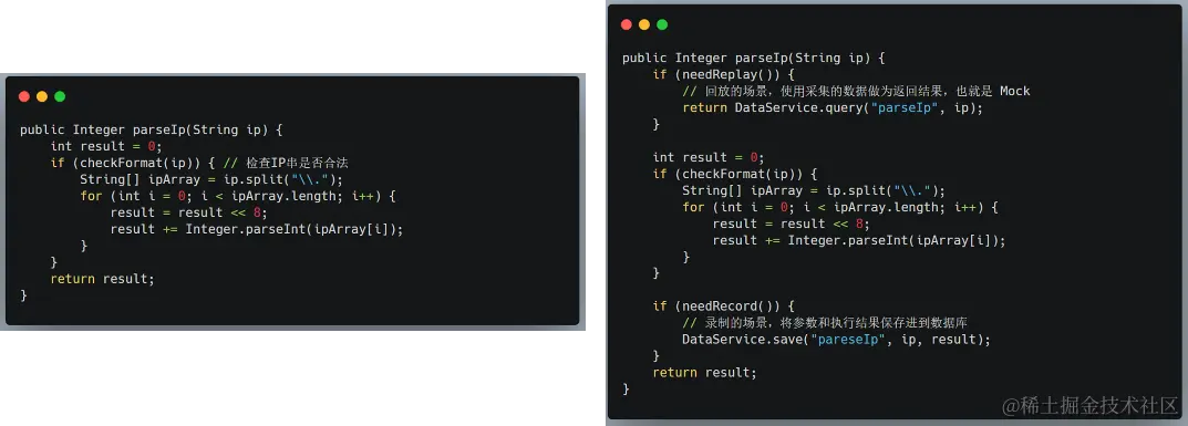 在函数入口部分,做了回放判断。如果需要回放,则使⽤采集的数据做为返回结果,也就是 Mock。