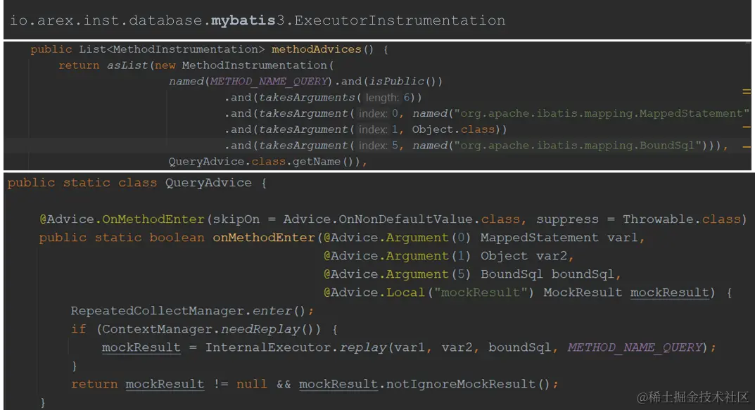 接下来,通过三个步骤来实现函数注入代码的功能。以下通过一个 Mybatis 的 Query() 函数来更直观地看看 AREX Agent 如何实现代码注入:
