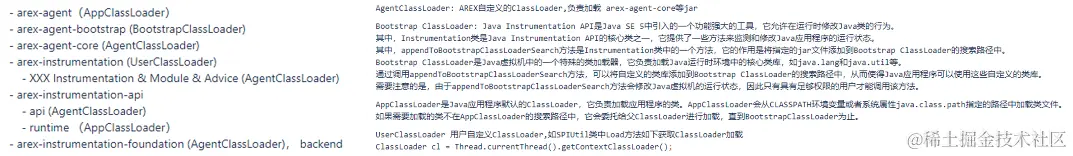 AREX 核心 JAR 是在一个独立的 ClassLoader 中加载,和用户的应用代码不互通。为了保证注入的代码可以在运行时被正确访问,对 ClassLoader 进行了简单的修饰,如下图所示。