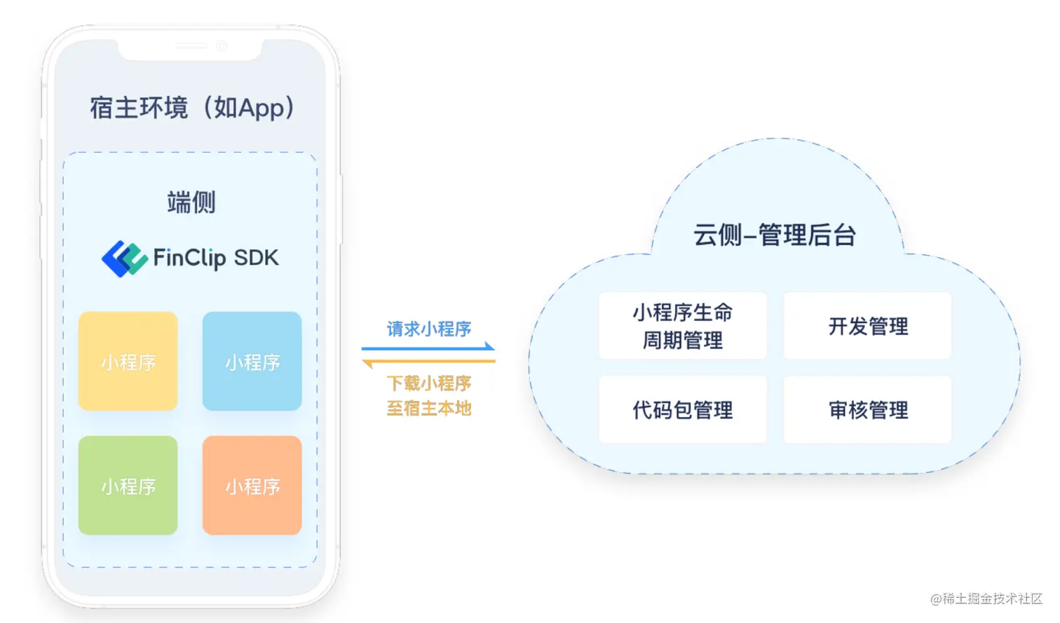 上面也说到,这个是大厂们推崇的技术方向,大部分的开发者还是无法享受到小程序技术带来的便捷性,但是也有类似 FinClip 这样的小程序容器技术帮助开发者在自己的 APP 中运行小程序,通过云侧管理后台可以实现小程序从开发到上线的全周期管理,从而能够拥有大厂们才具备的小程序热更新能力。