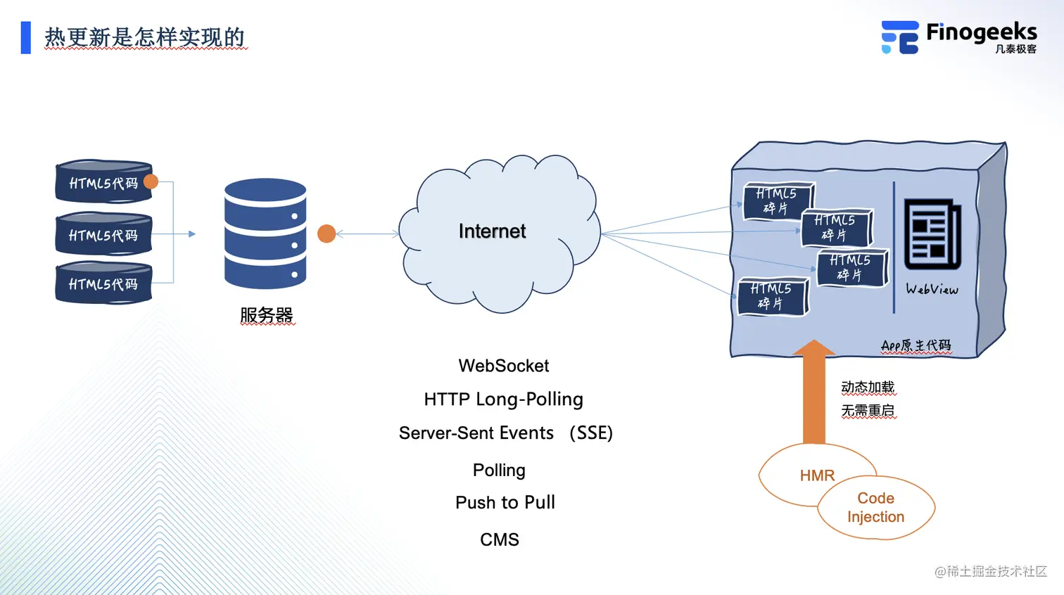 通常 APP 的服务器端要监测这些内容的更新,然后向设备端的 APP 以某种技术手段发送内容更新的通知,然后 APP 里的一些组件,需要向客户端通过网络同步一些页面内容碎片,并且把这些下载的内容,一般情况是 HTML 和 JavaScript,注入到之前挖好的这些洞洞里。