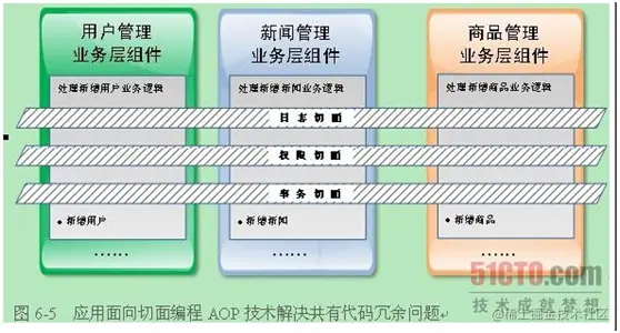 AOP就是纵向的编程,如业务1和业务2都需要一个共同的操作,与其往每个业务中都添加同样的代码,不如写一遍代码,让两个业务共同使用这段代码。在日常有订单管理、商品管理、资金管理、库存管理等业务,都会需要到类似日志记录、事务控制、 权限控制、性能统计、异常处理及事务处理等。AOP把所有共有代码全部抽取出来,放置到某个地方集中管理,然后在具体运行时,再由容器动态织入这些共有代码。